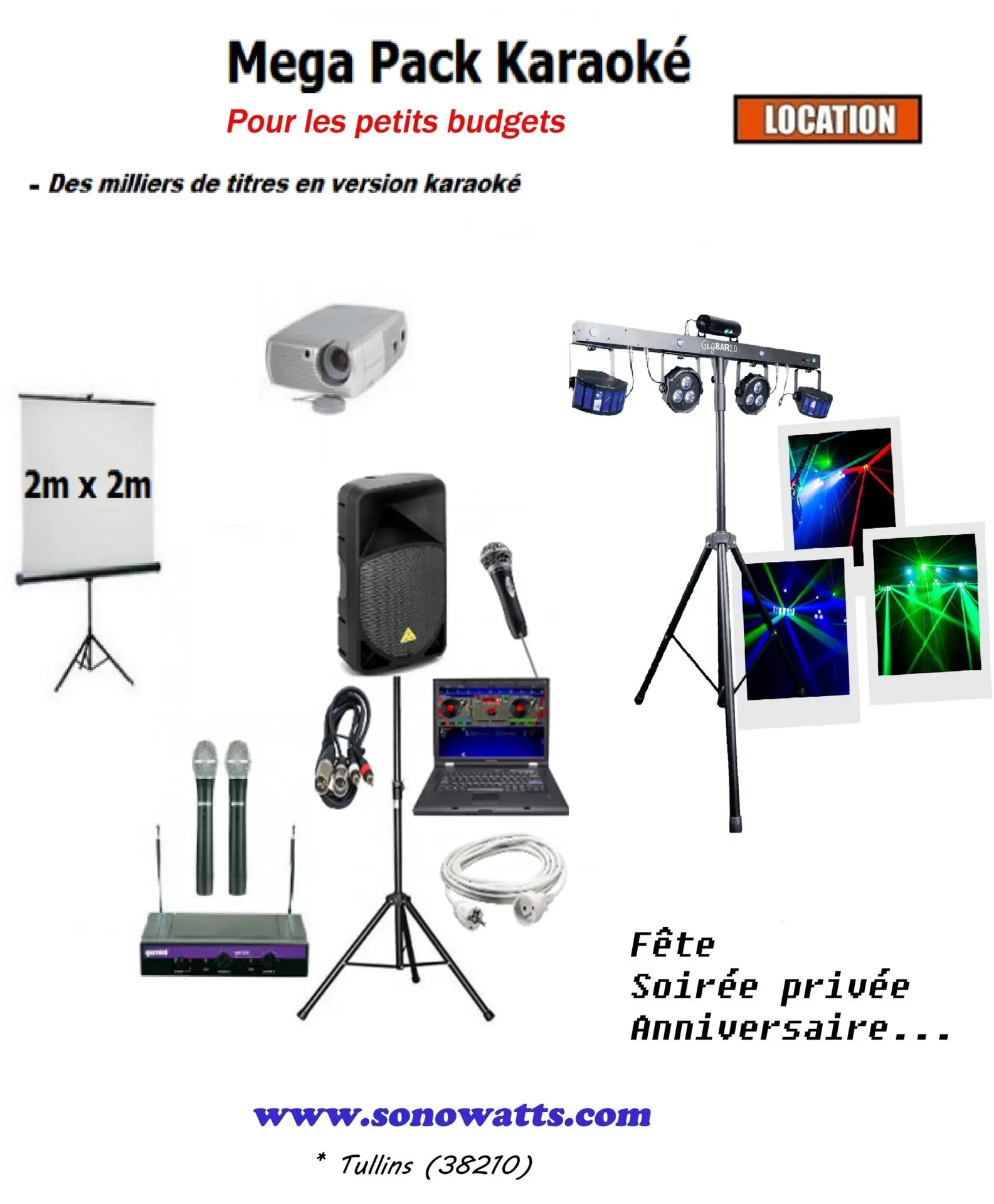 En bref : 1 enceinte 1000w + 1 PC portable avec option karaoké + 1kit de jeux de lumières + vidéoprojecteur + écran 2m/2m + 2 micros sans fil